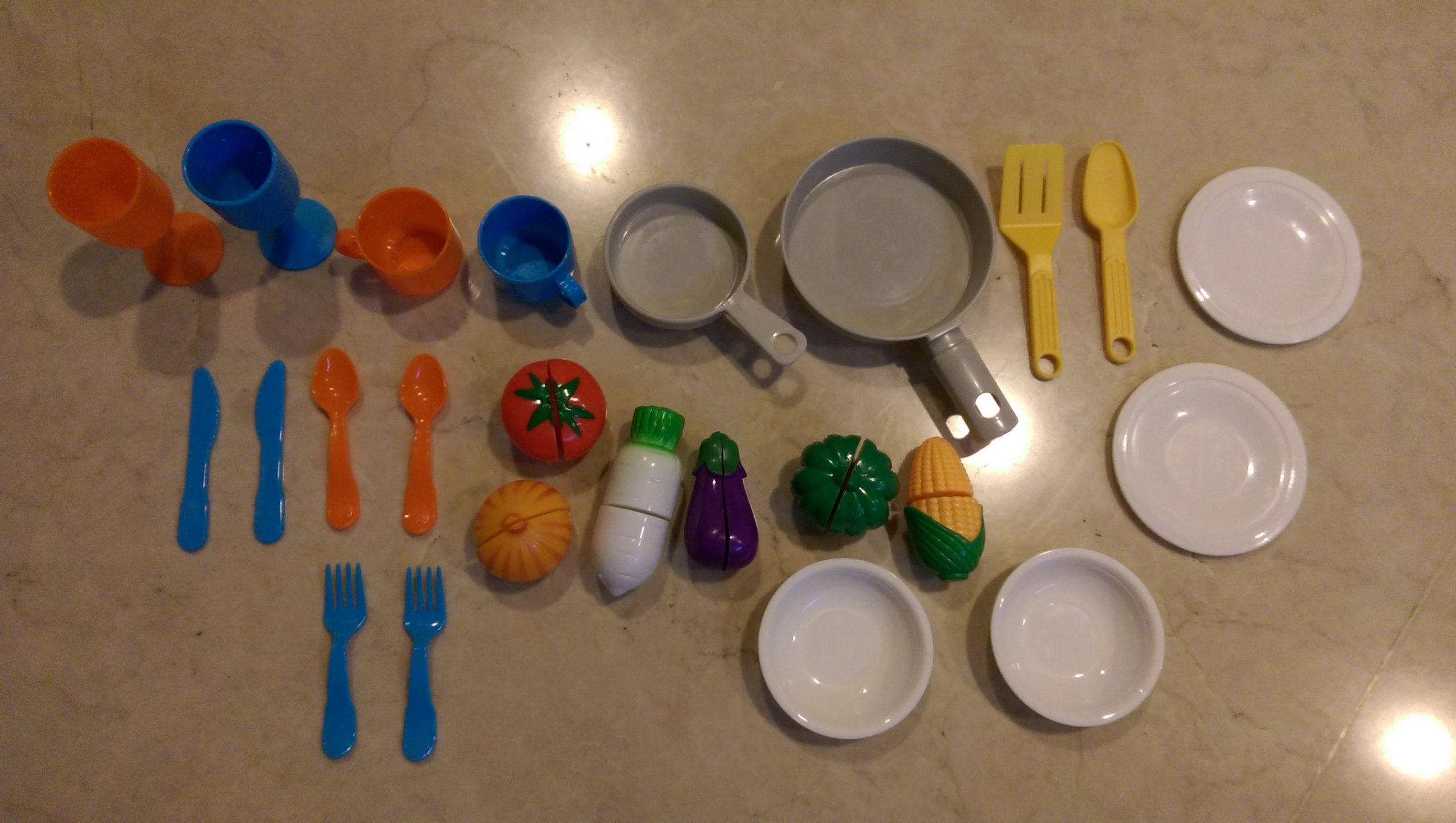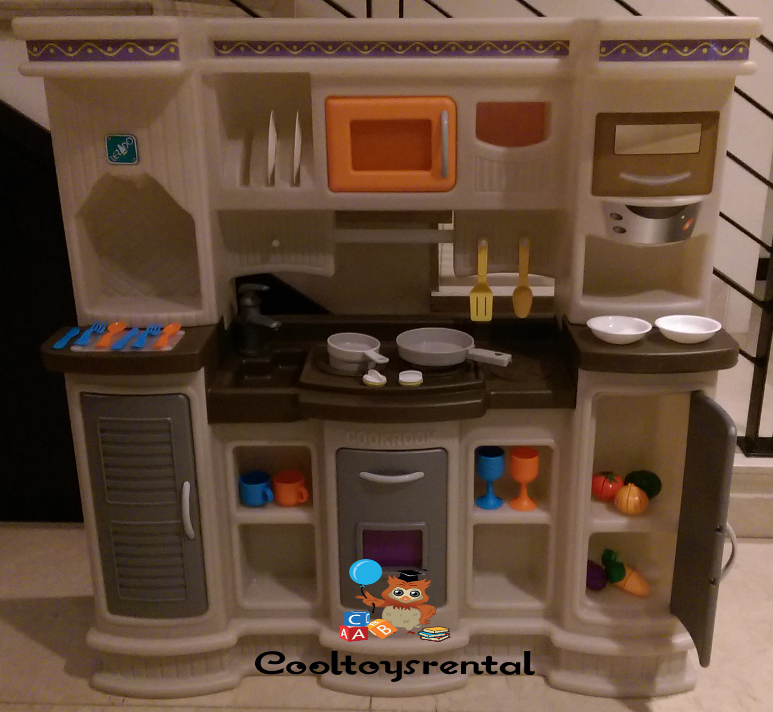 A deluxe kitchen from Lerado with 2 realistic sound stoves and a lot of accessories.