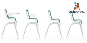- A hidden lift behind the footrest adjusts height easily and lets baby join in at the table