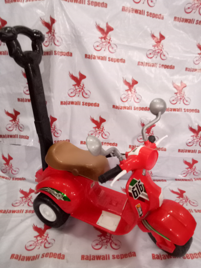 Mainan Vespa Mini dorong anak roda tiga untuk usia 1-3th. Dilengkapi dengan Musik, Lampu, dan dorongan yang bisa dilepas.