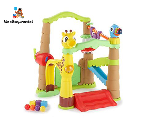 • Activities include a slide, monkey zip line, shape sorter, mailbox, peek-a-boo shutters, crawl-through giraffe arch, toucan & giraffe ball feeders, bead ball spinner, ladybug clickers, clicking clock, zig-zag ball drop, door bell, and swinging doors
